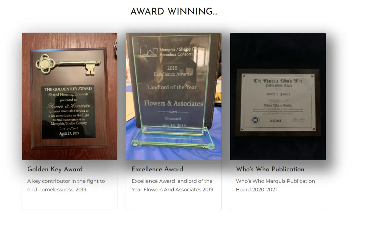 Robert's commitment to social responsibility led him to partner with non-profit organizations, providing housing solutions for disabled veterans, battered women, and other vulnerable groups. His efforts have been recognized with numerous accolades, including the prestigious Golden Key Award and the title of Landlord of the Year in 2019, as well as various certificates of achievement from Memphis Area Legal Services and the City of Memphis Homeless Consortium. Also, included into the Who's Who publication.